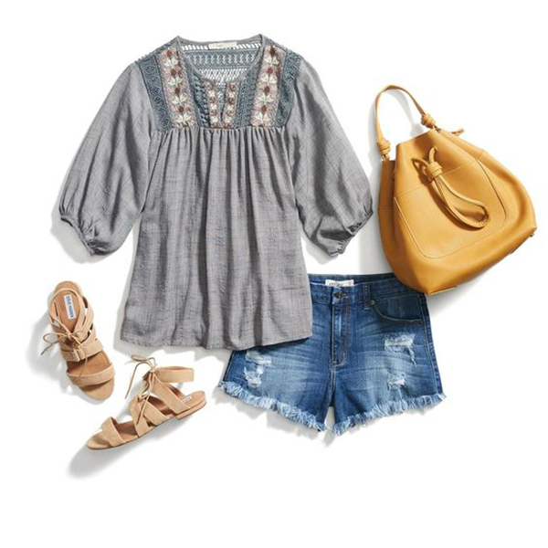 2. เสื้อผ้าฝ้ายแขนจั๊มทรงปล่อยกับกางเกงขอสั้นในวันสบายๆ